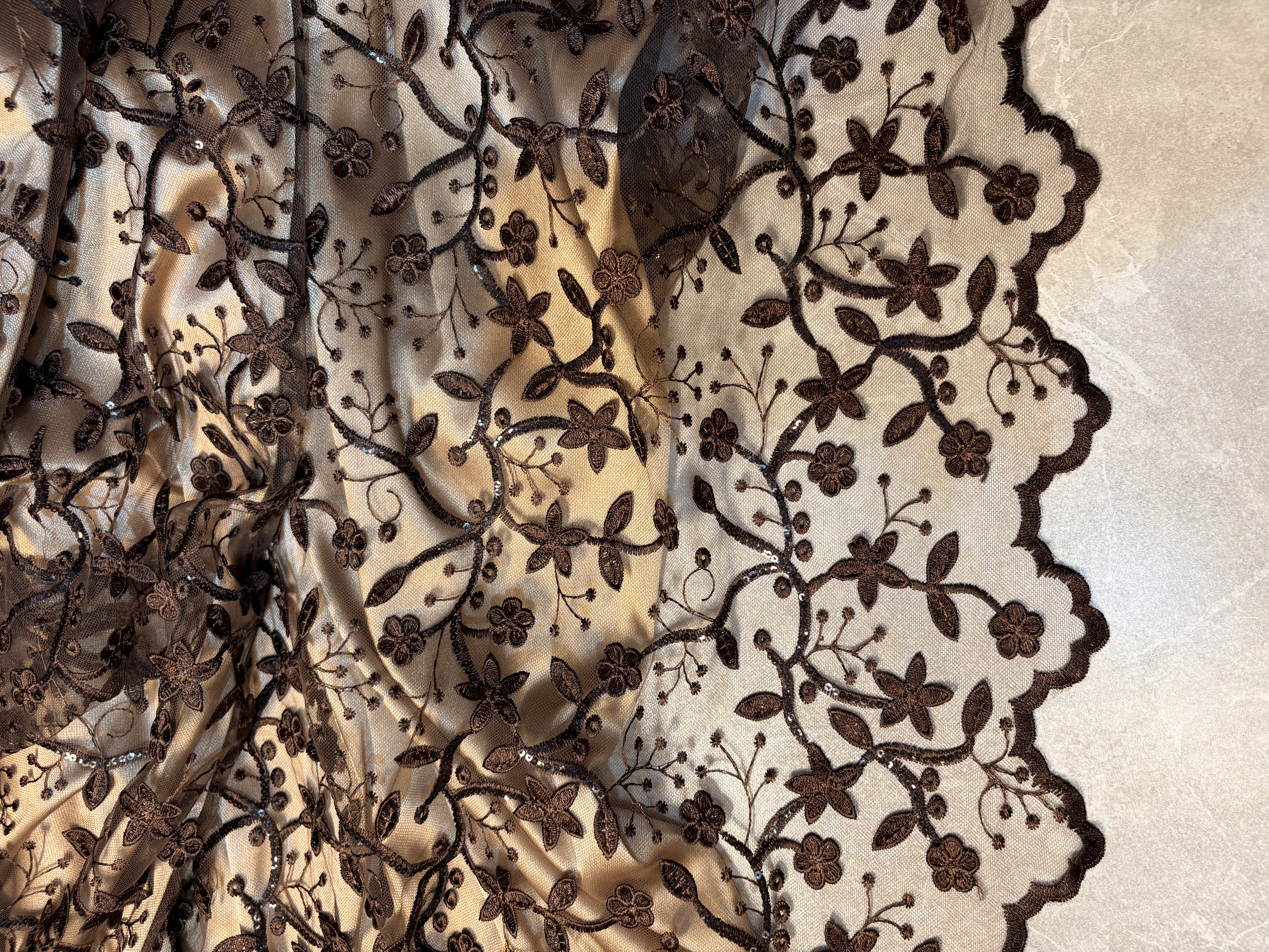 تور گلبرجسته همراه با پولکدوزی بسیار ظریف عرض پارچه ۱۳۰ و حاشیه دالبر در دو سمت پارچه مناسب برای دوخت انواع پیراهن مجلسی